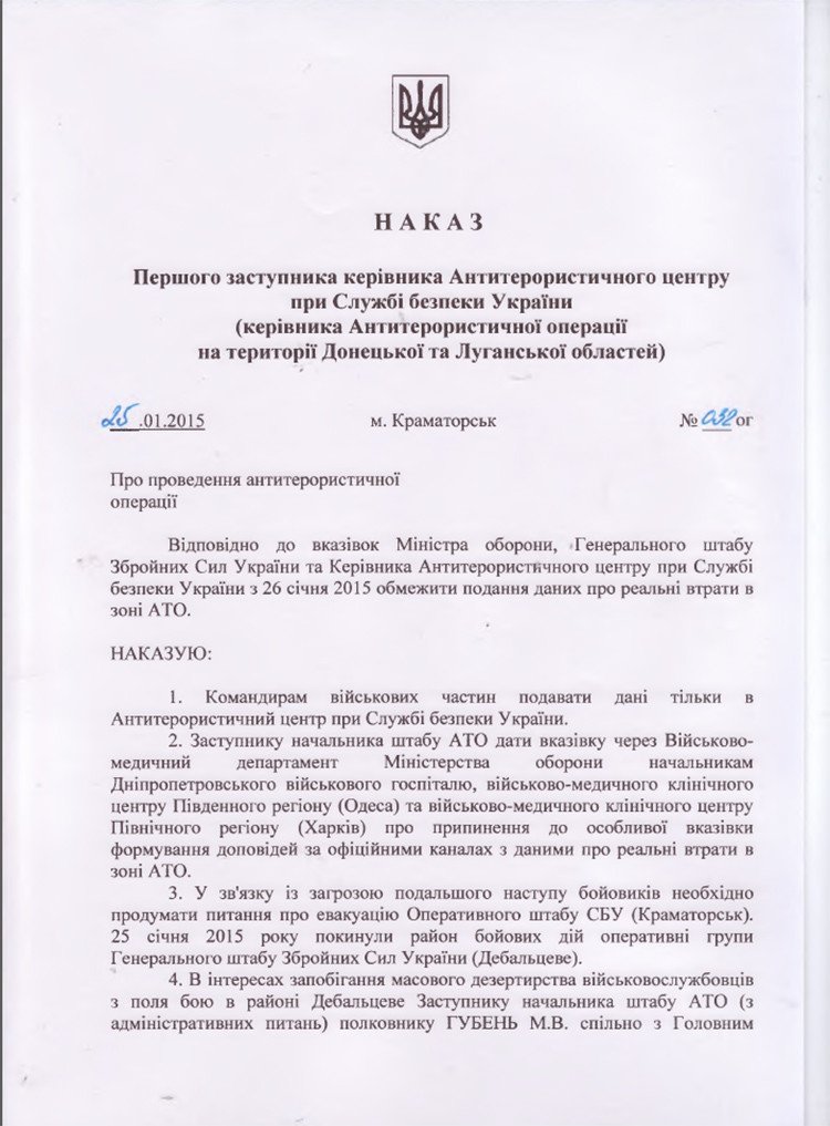 "Los comandantes de destacamentos militares deben facilitar los datos [sobre las bajas] solo al Centro Antiterrorista del Servicio de Seguridad de Ucrania", reza una de estas órdenes. Otra prohíbe a los departamentos médicos militares hacer informes que incluyan datos verdaderos sobre las bajas en la zona de la operación militar. La siguiente orden insta a "formar las llamadas 'tropas de contención' a base de batallones de voluntarios".