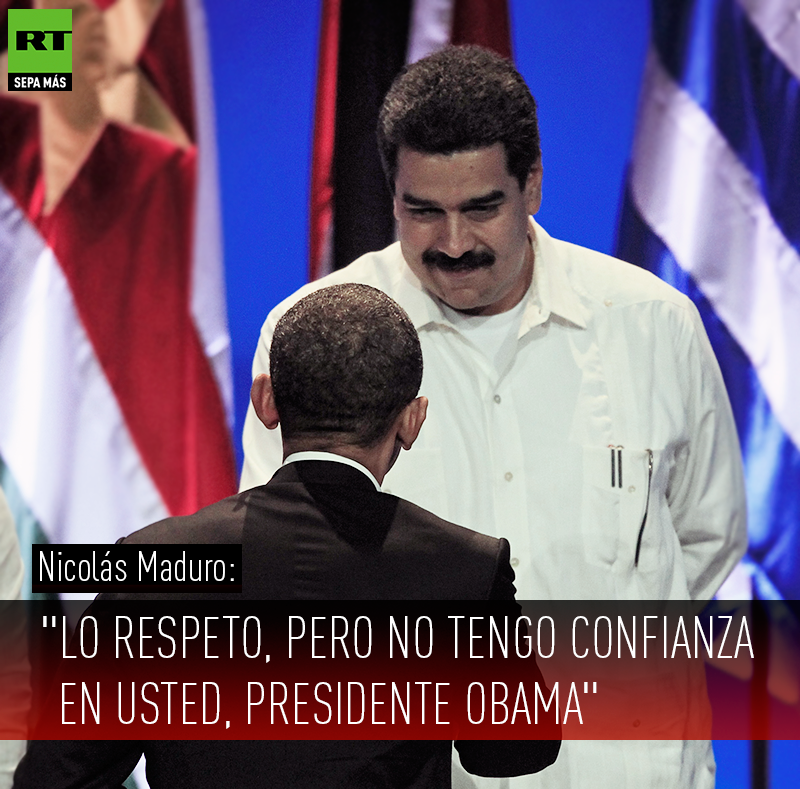 — Nicolás Maduro (@NicolasMaduro) 9 апреля 2015Un día antes de la Cumbre, el presidente de EE.UU., Barack Obama, se expresó en estos términos: "No creemos que Venezuela sea una amenaza para Estados Unidos, y Estados Unidos no es una amenaza para el Gobierno de Venezuela".