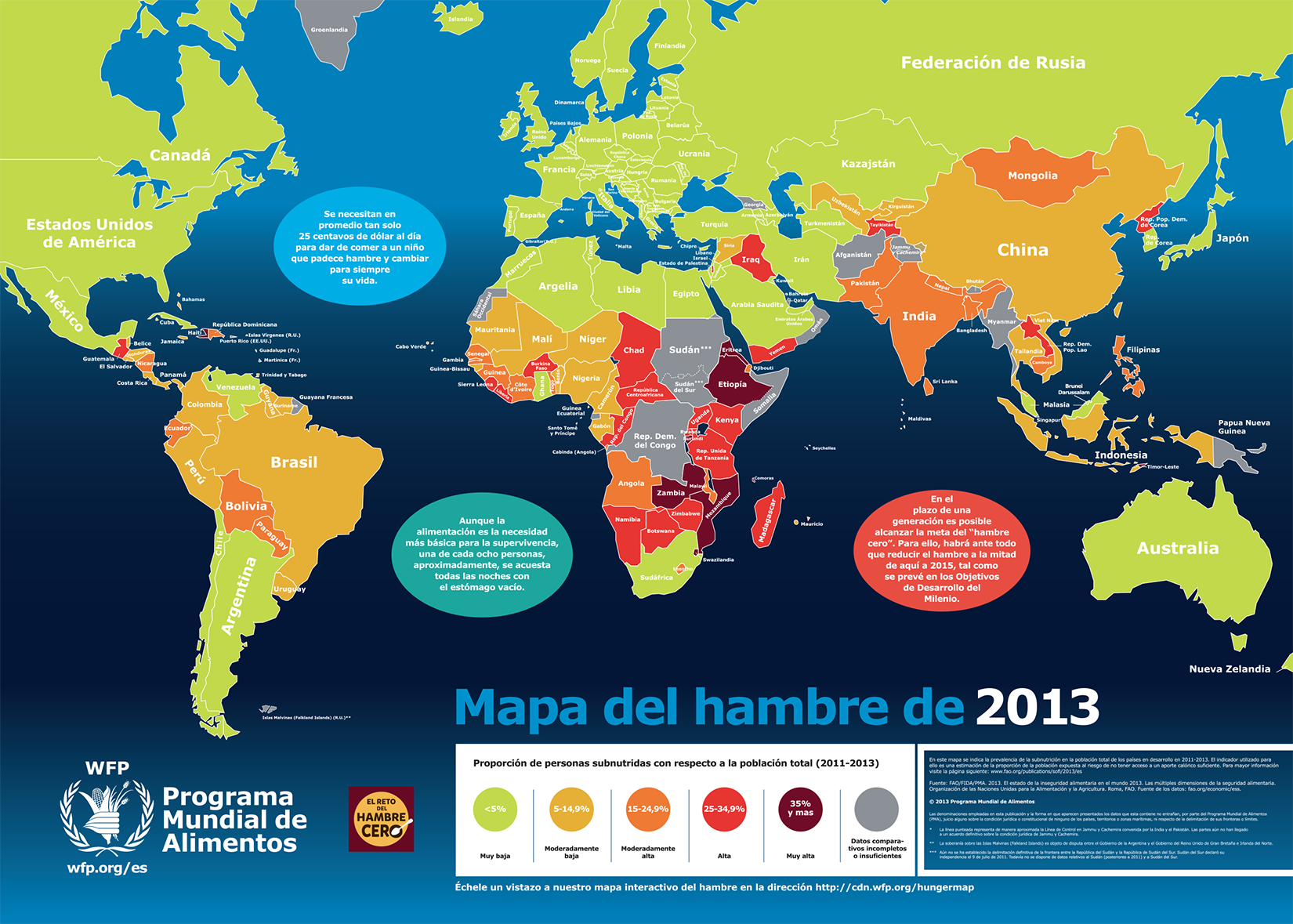 A escala mundial, Rusia, EE.UU., los países europeos, y la mayoría de Oriente Medio, se destacan por índices muy bajos de la prevalencia de subalimentación.