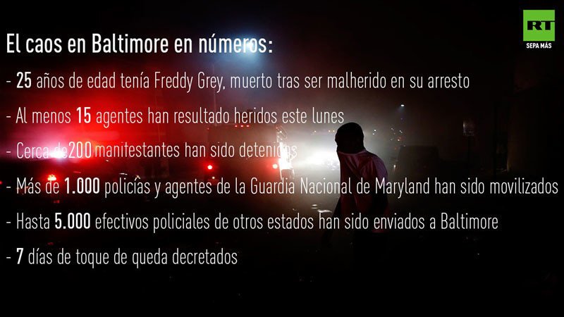 Según el último balance policial, al menos 15 agentes han resultado heridos y 200 personas han sido detenidas como consecuencia de los enfrentamientos entre la Policía y los manifestantes. Entretanto el gobernador de Maryland ha declarado el estado de emergencia. Desde la muerte de Freddie Gray, las protestas han sido ininterrumpidas.