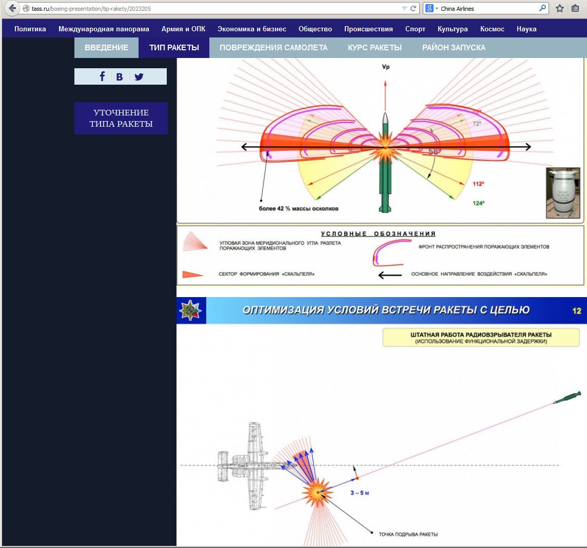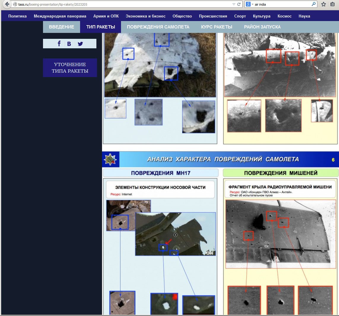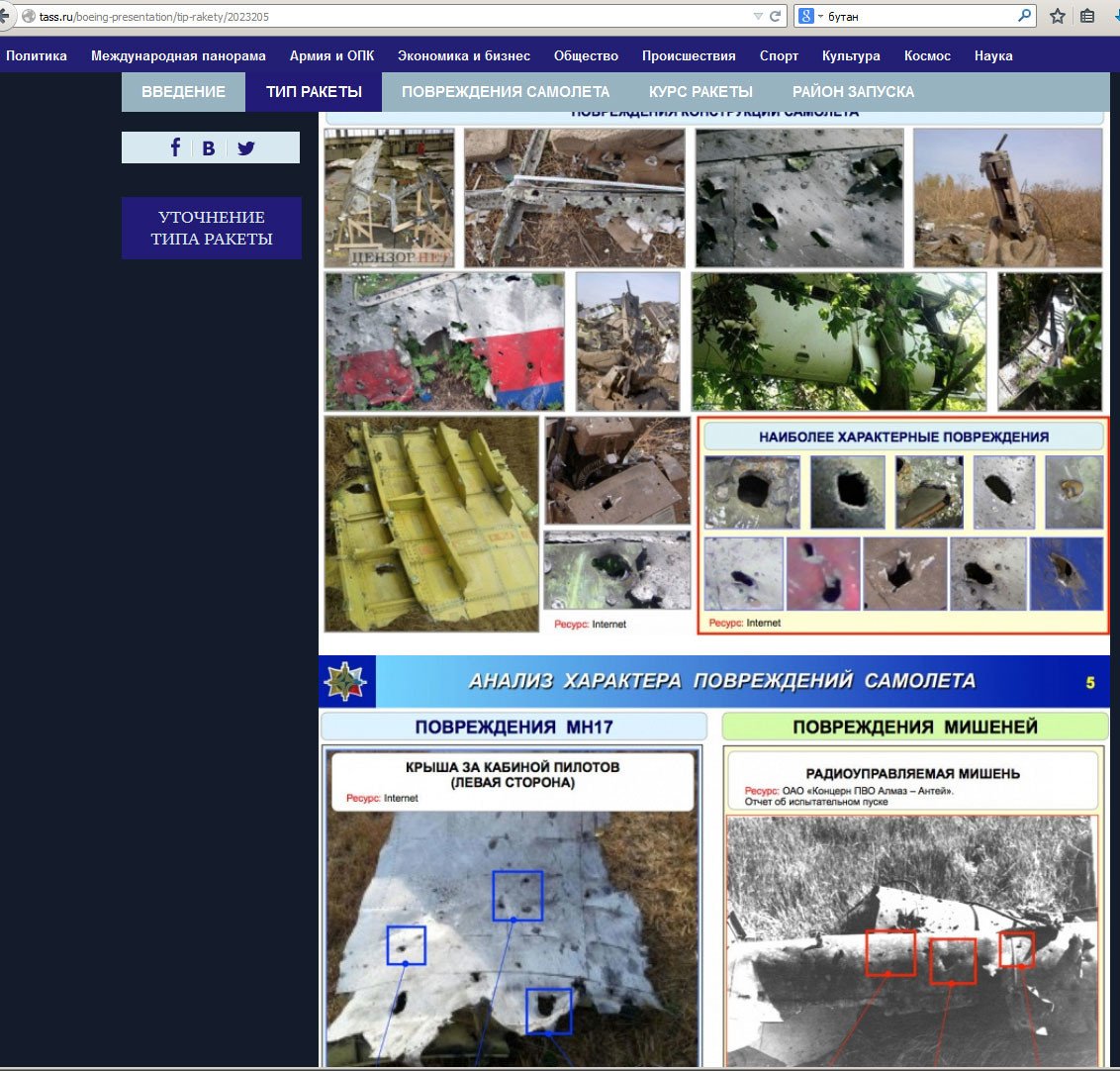 En la primera parte del informe se indica que el misil que pudo haber causado la catástrofe es el 9M38M1 del complejo antiaéreo Buk-M1. Almaz-Antei presenta las fotos que muestran los daños causados por el impacto de un 9M38M1 contra un objetivo especial controlado por radio durante unas pruebas. Puede apreciarse que los daños que recibió el blanco y los del Boeing malasio son idénticos.