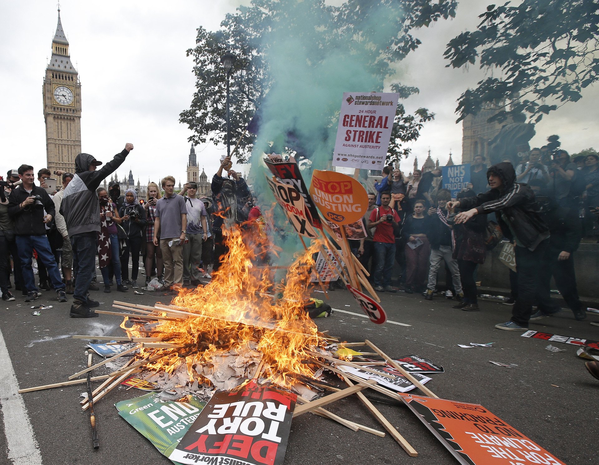 En las calles de Londres se celebra una multitudinaria manifestación, organizada por el grupo The People's Assembly Against Austerity (Asamblea del Pueblo contra la Austeridad) en contra de las medidas de austeridad y la reciente victoria del Partido Conservador en las elecciones generales del Reino Unido.