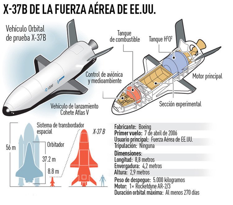 El X-37B, construido por Boeing, es similar a un transbordador espacial en miniatura. Pesa cinco toneladas y tiene algo más de tres metros de altura y casi nueve de largo. Su envergadura es de menos de 4,6 metros. El primer vuelo se llevó a cabo en abril del 2010.