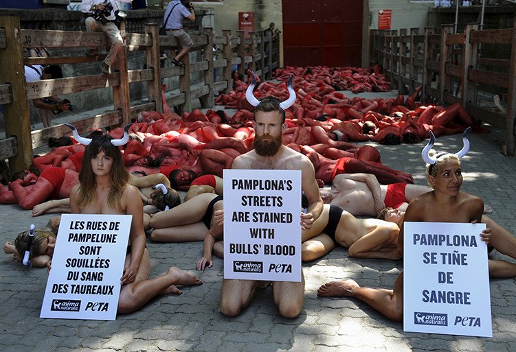 Por decimoquinto año, más de 150 activistas y simpatizantes de las organizaciones activistas defensoras de los animales PETA y AnimaNaturali se congregaron el sábado pasado en el acceso a la Plaza de Toros de la capital navarra para cubrir sus cuerpos de pintura roja y protestar contra "el reguero de sangre que dejan los toros que corren cada día los encierros" en las fiestas de San Fermín, informa 'Noticias de Navarra'.