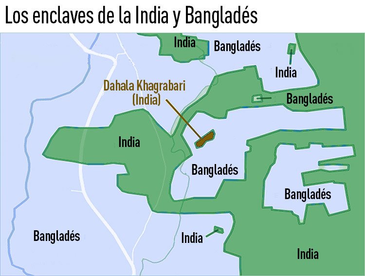 Un caso único es el del enclave de Dahala Khagrabari, escribe 'The Washington Post'. Este territorio indio está rodeado por un territorio de Bangladés que a la vez se encuentra en un enclave indio inserido en el territorio de Bangladés. Si quieren entenderlo mejor echen una ojeada al mapa.