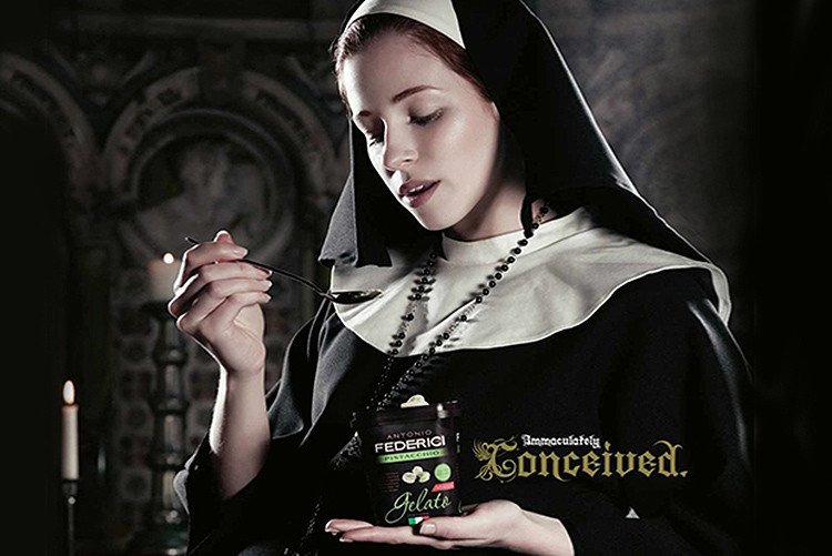 En una imagen se veía a una monja vestida con su hábito tradicional y con la cabeza cubierta, mirando un helado sin poder resistir la tentación. Su extraña mirada no asombra, lo llamativo de la imagen es que la monja está embarazada. La imagen iba acompañada del eslogan: "Concebido sin mancha. Nuestra religión es el helado". La publicidad causó un vendaval de críticas tanto entre religiosos como laicos. En 2013 el helado Antonio Federici dejó de existir.