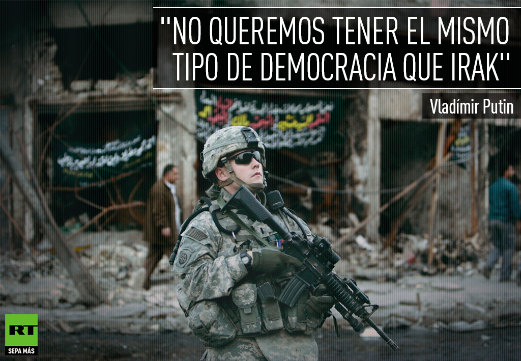 En 2006, durante una cena privada con Vladímir Putin, el entonces presidente norteamericano, George Bush, aseveró que quería promover el cambio institucional en partes del mundo como Irak, "donde hay libertad de prensa y de culto" y añadió: "Sé que mucha gente en el mundo dijo que querrían lo mismo en Rusia". El líder ruso respondió fríamente que "ciertamente, no queremos tener el mismo tipo de democracia que Irak".