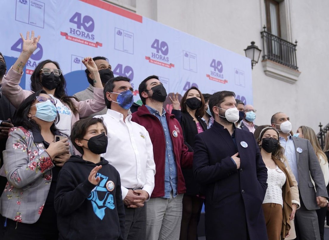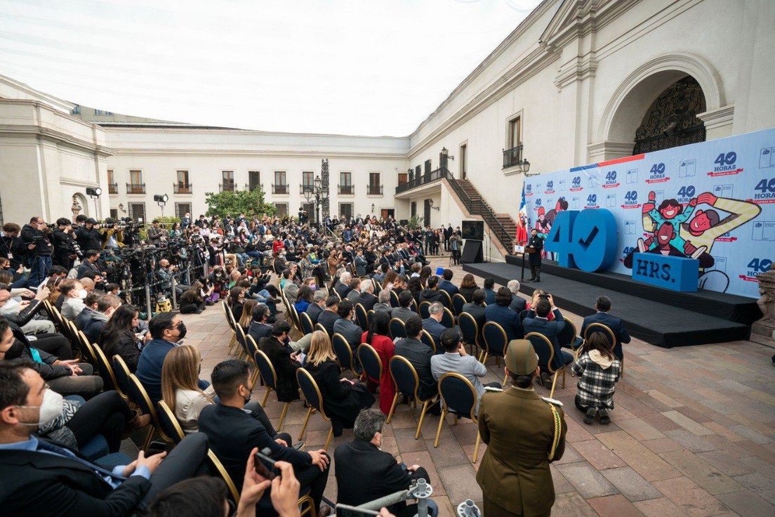 En un acto realizado el martes en el Palacio de la Moneda, sede del Ejecutivo chileno, el presidente Boric junto a otros altos funcionarios de gobierno, habló sobre la importancia de reducir de 45 a 40 horas semanales las horas de trabajo, al considerar que es una apuesta en favor de la calidad de vida, la salud mental, la recreación y el tiempo libre, para que las familias puedan compartir con sus seres queridos.