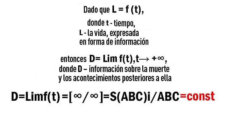 La función es L = f (t), donde L es vida, y t es tiempo, mientras que la respuesta es una constante (en rojo). Según él, la respuesta es que hay vida después de muerte, y que depende solo de la experiencia personal de una persona, es decir de la información que ha recibido y producido.