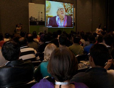 Videoconferencia con Ray Bradbury con motivo del homenaje que la XXIII Feria Internacional del Libro de Guadalajara le hizo al autor angelino. Bradbury charla con Sam Weller. Guadalajara, México © Cortesía FIL Guadalajara / Diego Zavala Scherer