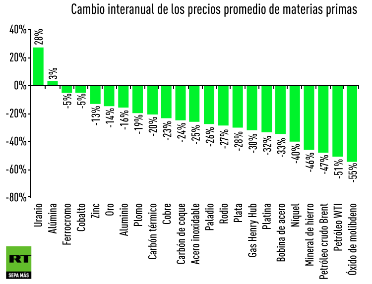 El precio del uranio, utilizado como combustible en plantas de energía nuclear, aumentó un 28% en los últimos 12 meses, indica el informe de Macquarie Group citado por 'Business Insider'. Los precios del resto de materias, excepto el de la alúmina, que creció un 3%, se han derrumbado debido a la reducción de la demanda.