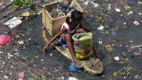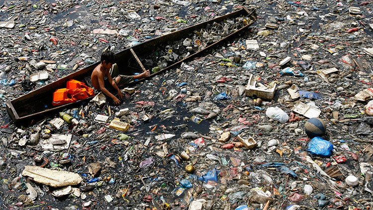En las chocantes imágenes se puede ver cómo los niños se esfuerzan por mantener sus cabezas fuera del agua, nadando en un río lleno de basura. Otros se balancean en balsas o barcos improvisados mientras recogen material reciclable de la basura que flota en las aguas contaminadas.