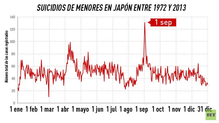 En un diagrama, difundido por fuentes gubernamentales, de la distribución del conjunto de suicidios entre los días del año se aprecia un pico de unos 130 suicidios que se eleva dramáticamente por encima del índice medio diario de 49,4. Y el caso es que la fecha coincide en el país del sol naciente con el comienzo del año escolar.