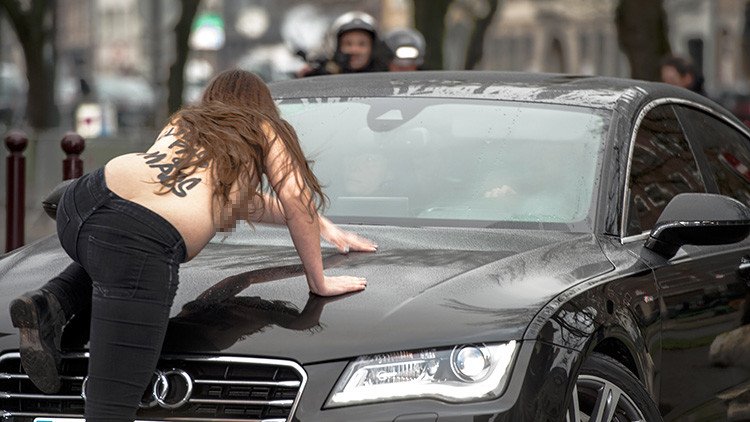 Una de las tres activistas, desnuda hasta la cintura, logró encaramarse al capó del vehículo. Las tres fueron detenidas casi inmediatamente por la policía.