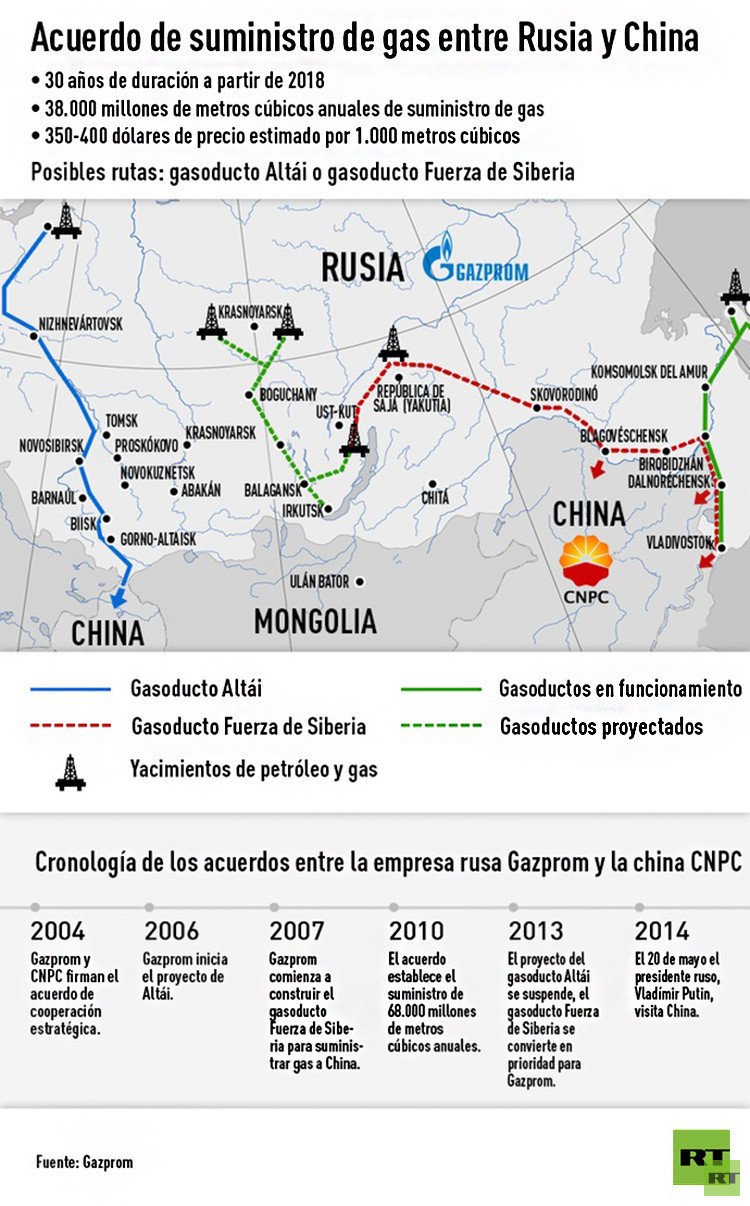3. El jefe de Gazprom, Alekséi Miller, y el vicepresidente de Corporación Nacional de Petróleo de China Wang Dongjin han firmado un acuerdo sobre las condiciones básicas de los suministros de gas de Rusia a China por la ruta occidental. El gasoducto Altái o 'ruta occidental' será un competidor directo del suministro de gas ruso a Europa.