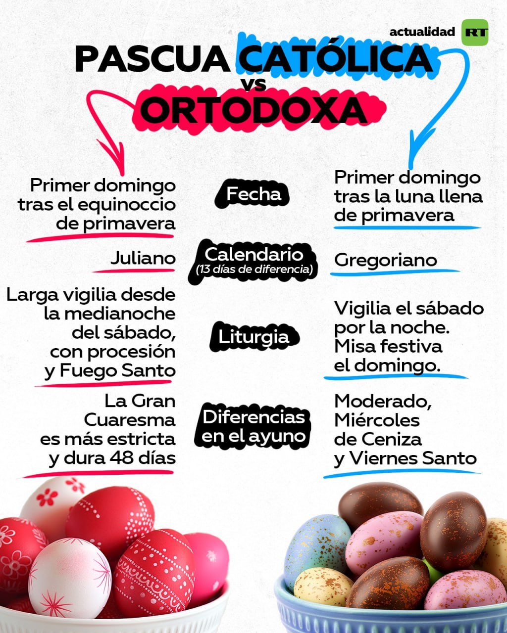 La diferencia más notable entre la Pascua ortodoxa y la católica es la fecha de su celebración. La Iglesia ortodoxa se rige por el calendario juliano, que va 13 días por detrás del gregoriano utilizado por la Iglesia católica, por lo que las festividades ortodoxas normalmente se celebran unos días más tarde que las católicas. Sin embargo, en 2025 ambas Pascuas coinciden el mismo día.