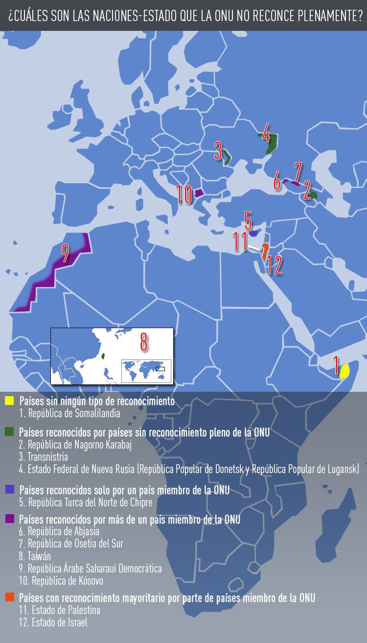 La presente infografía muestra la localización de las regiones mundiales no reconocidas plenamente por todos los países miembro de la Asamblea General de las Naciones Unidas junto con una leyenda que indica el grado de aceptación.