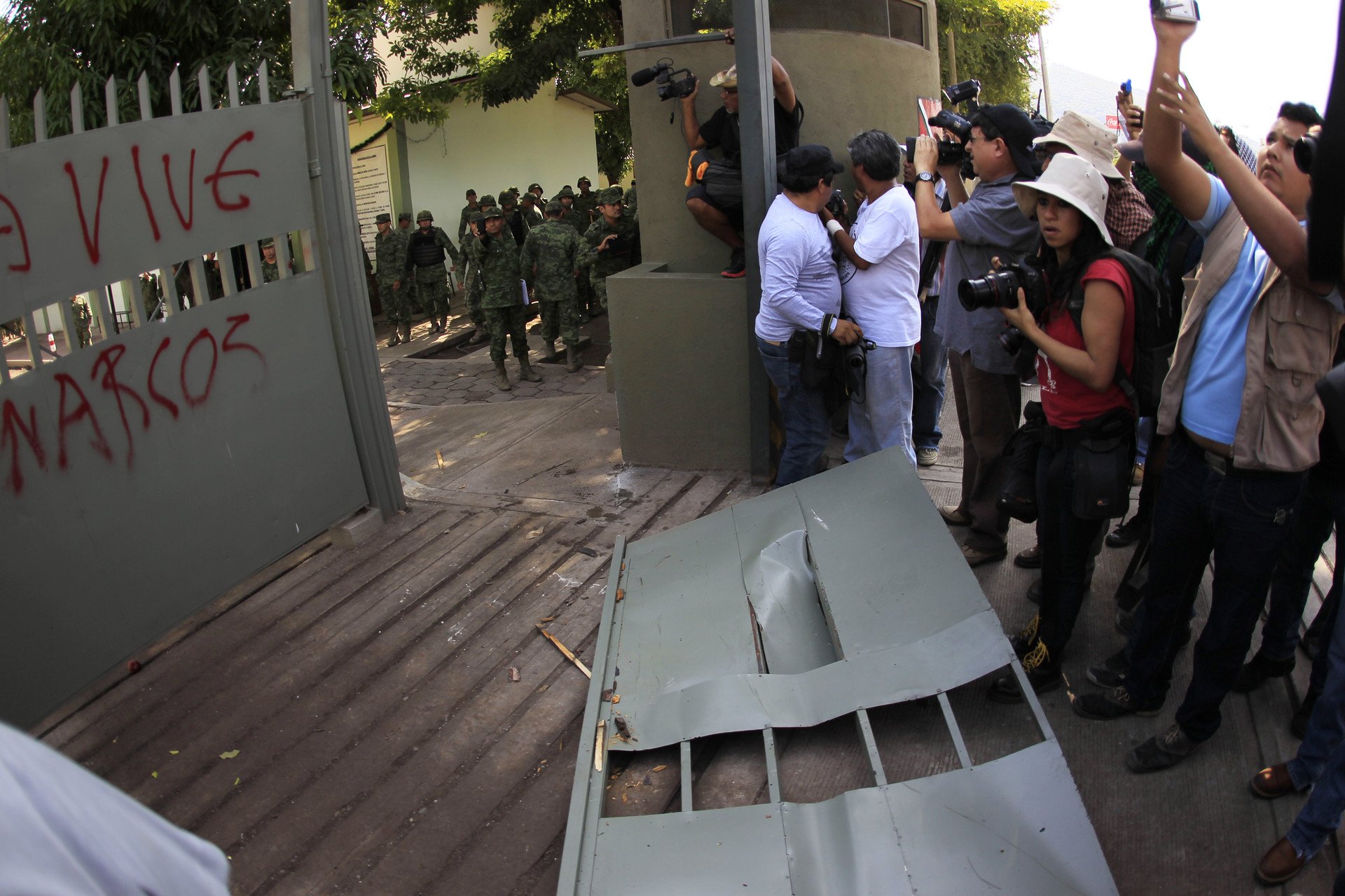 Varios jóvenes llegaron hasta el portón y comenzaron a empujarlo para mostrar su repudio por la desaparición de los 43 normalistas. Un grupo de militares aguantaron el portón desde su interior y evitaron que la puerta se abriera. Sin embargo, varios marchistas forcejearon una de las puertas laterales, la derribaron y la destrozaron.