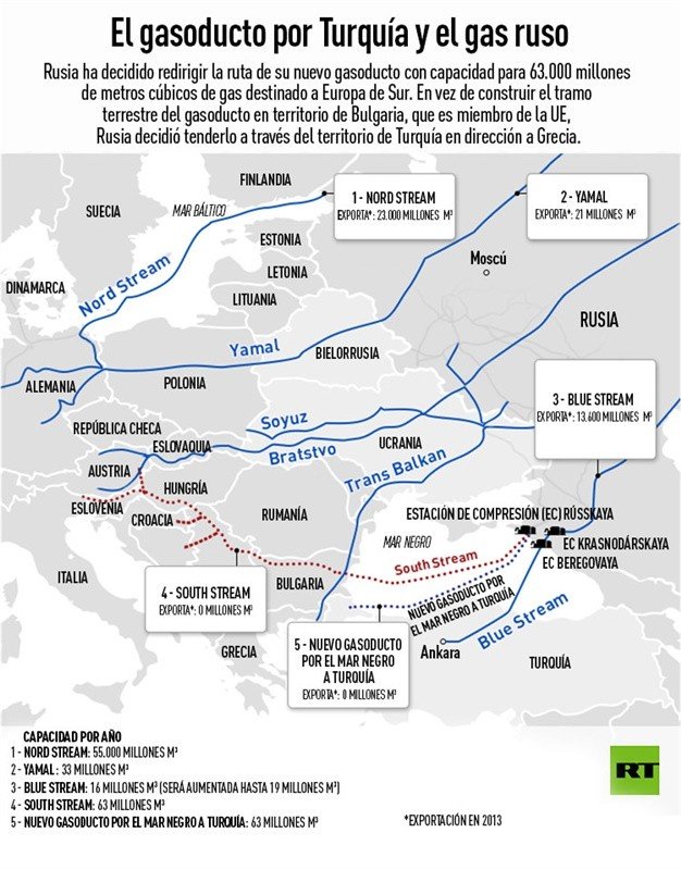 Así a finales del 2014 Rusia decidió suspender el gran proyecto de gasoducto South Stream, que tenía que pasar por territorio de varios países europeos, eludiendo a Ucrania, ante la oposición de parte de la UE. En vez de seguir negociando sobre la construcción del gasoducto con países miembros de la UE, como Bulgaria, Rusia se puso de acuerdo con Turquía, para construir el nuevo gasoducto en su territorio, que llevará gas ruso hacia Grecia.
