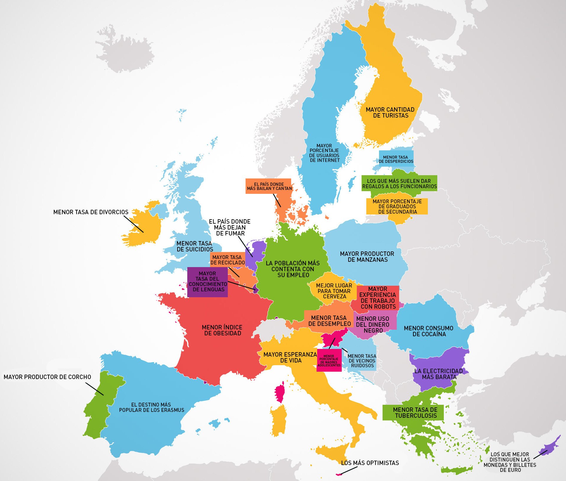 La escritora Kate Peregrina, del portal Thrillist, ha elaborado un mapa que muestra lo mejor de cada país de la Unión Europea. Las conclusiones de Peregrina se han obtenido a base de diferentes estudios e investigaciones de la oficina estadística de la Comisión Europea, Eurostat.