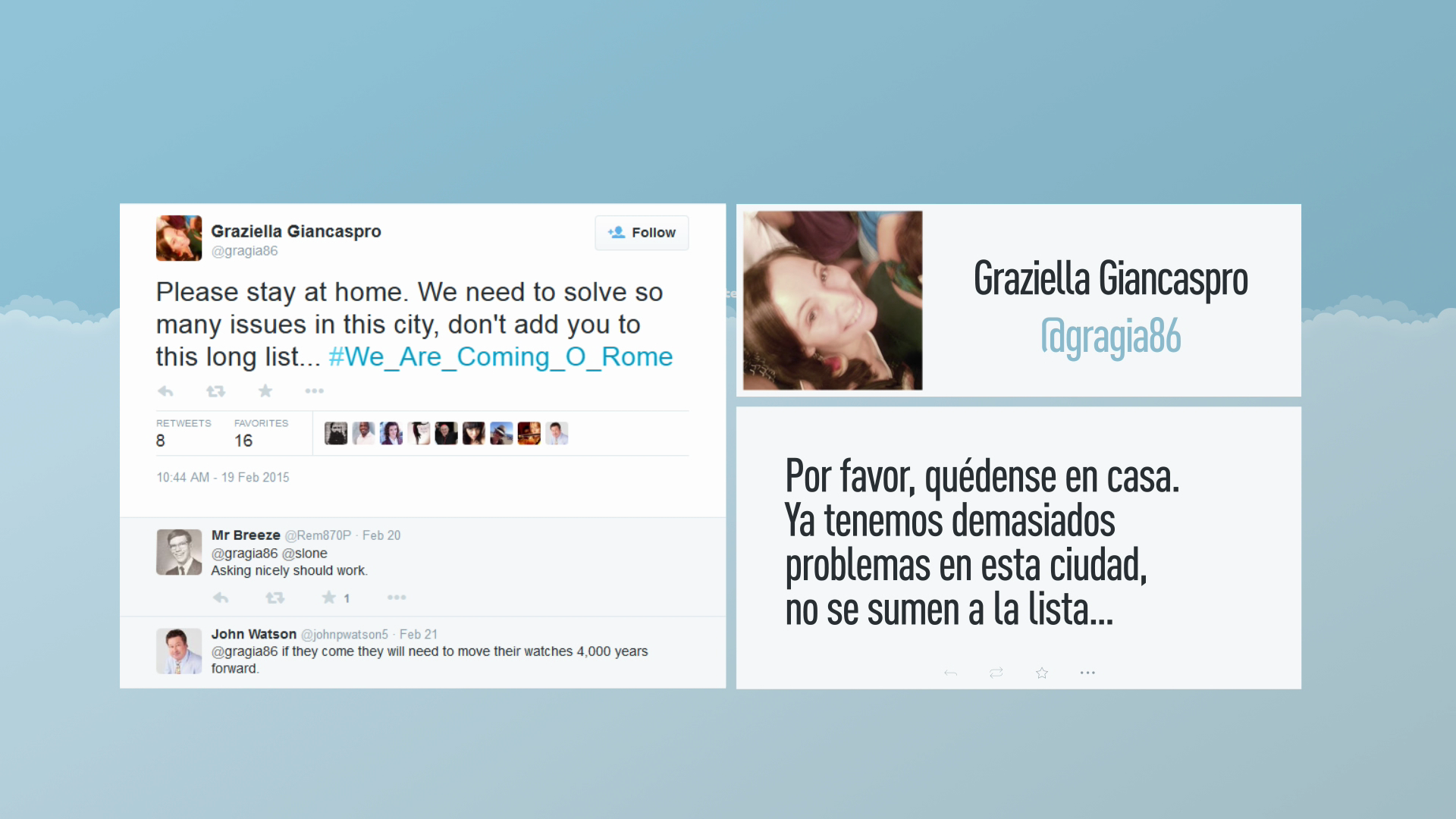Sin embargo, parece que la amenaza no ha tenido el efecto esperado. Los internautas italianos empezaron a usar en las redes el 'hashtag' #We_Are_Coming_O_Rome (Estamos llegando a Roma, en inglés), lanzado anteriormente por los propios yihadistas, para responder con una serie de consejos de viaje llenos de humor.
