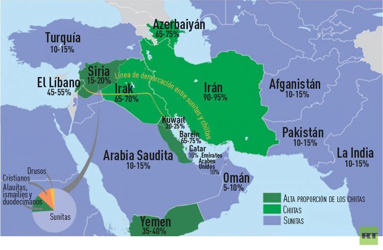 El conflicto entre sunitas y chiitas es una de las principales contradicciones en el mundo islámico. La presencia e influencia de estas dos ramas del islam en la región se explica en el primero de los mapas, publicados por el portal vestifinance.ru.
