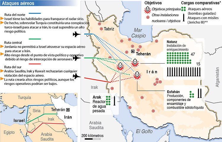 A lo largo de años anteriores, los medios de comunicación y los analistas reflexionaron mucho sobre posibles ataques aéreos contra las instalaciones nucleares de Irán por parte de Israel. Una de las hipótesis distinguía tres rutas (del norte, del centro y del sur) para dichos ataques.