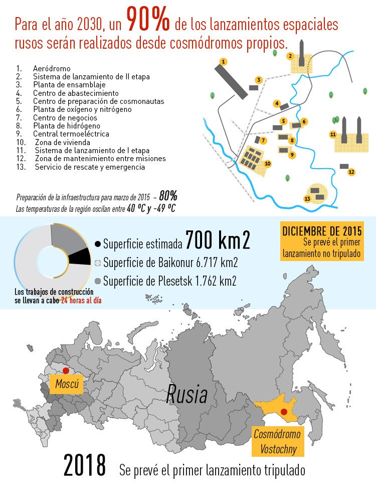 El nuevo cosmódromo ruso Vostochny, que se está construyendo en la provincia de Amur, en el Lejano Oriente Ruso, pretende reducir la carga sobre el Cosmódromo de Baikonur, ubicado en Kazajistán, con el objetivo final de sustituirlo por completo tras finalizar el contrato de su arrendamiento en 2050.