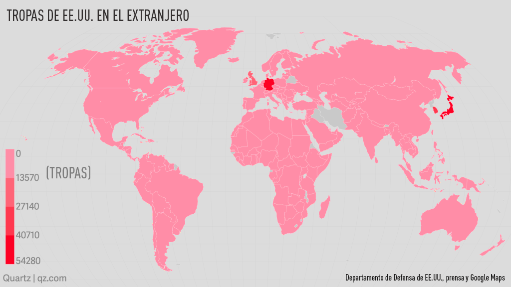 Según un reciente informe del Departamento de Defensa de EE.UU. y la información de su Centro de Datos del Personal de Defensa, Estados Unidos cuenta con bases militares en al menos 74 países (la mayor parte en Europa, África y América Latina) y tropas alrededor de prácticamente todo el mundo.