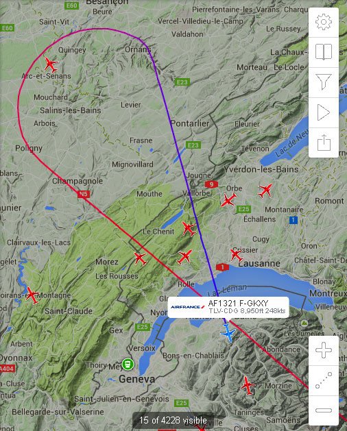 Después de un descenso, el vuelo AF1321 se estabilizó en una trayectoria recta en dirección a Ginebra y actualmente ha aterrizado en el aeropuerto de esta ciudad suiza.