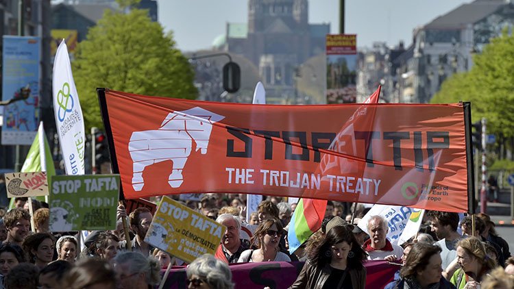 Cerca de 4.000 personas han marchado por las calles de Berlín donde están situadas las sedes diplomáticas de Estados Unidos y Canadá, informa la agencia RIA Novosti. Llevaban pancartas con los lemas "Abajo la OTAN económica", "Paren el TTIP-CETA", "No al trigo genéticamente modificado" y "Contra el TTIP, por la democracia y los derechos civiles".