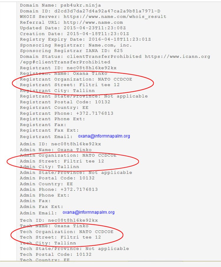 Según la información de DomainTools, una herramienta de monitoreo de nombres de dominio e investigación de crímenes cibernéticos, el registrador de Mirotvórets es NATO CCD-COE y Oxana Tinkó es la empleada responsable del registro, que operan en la capital estonia.