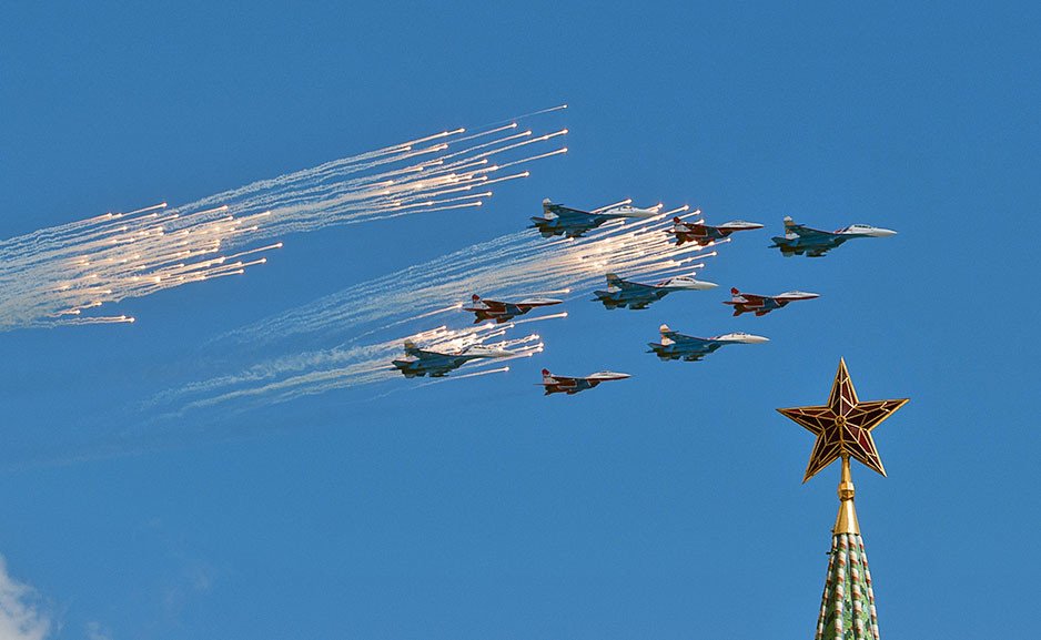 "En una misma formación aérea y a una altura de 200 metros sobre la Plaza Roja han sobrevolado los aviones y helicópteros más modernos de largo alcance, transporte militar, cazas, bombarderos y de ataque del Ejército de Aviación", ha anunciado Igor Klímov, responsable del Ministerio de Defensa para las Fuerzas Aéreas.