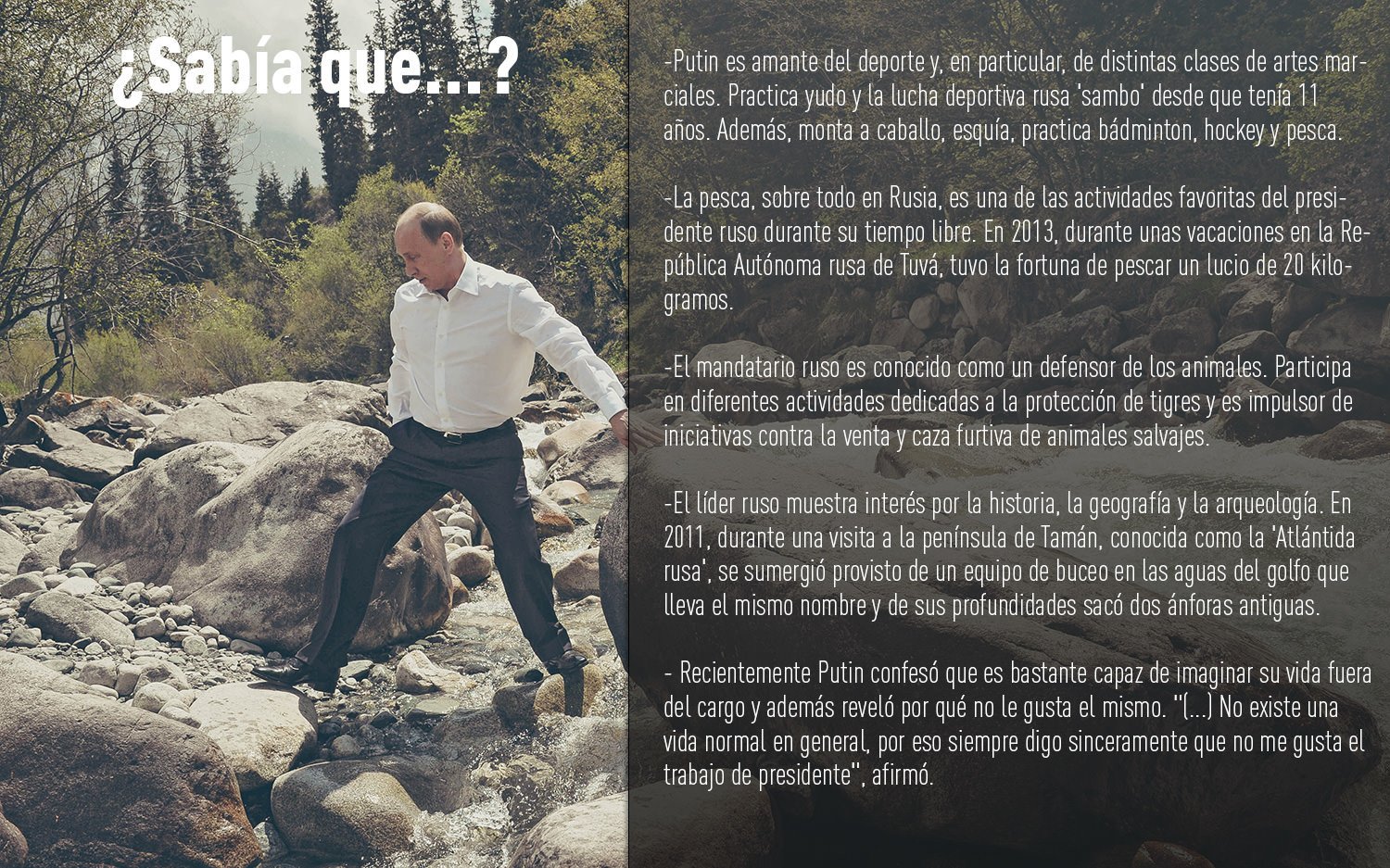 "Tenemos una gran cantidad de componentes que nos permiten considerarnos un país que realmente lleva a cabo una política independiente y soberana en el ámbito internacional y realiza las políticas internas tal como requiere nuestro pueblo. Y en este sentido, nosotros somos un socio muy fiable, porque no nos adaptamos al son que tocan otros", declaró en abril el jefe de Estado ruso, en el marco de una entrevista concedida al canal Rossía24.