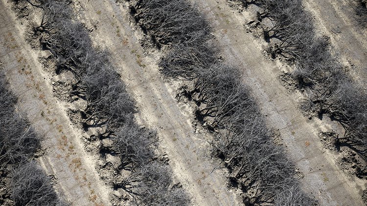 Un campo de almendros muertos en Coalinga, Valle Central.