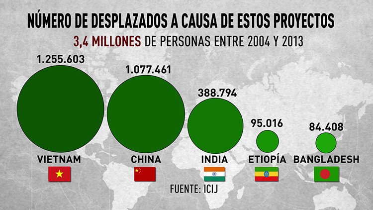 3,4 millones de personas sufren los efectos de estos programas de desarrollo. Miles de personas se ven desplazadas, reubicadas o desprovistas de sus propiedades contra su voluntad. Vietnam, China, la India, Kenia o Etiopía son algunos de los países más afectados. Y en América del Sur surgen cada vez más voces en contra de estas políticas 'de desarrollo'.