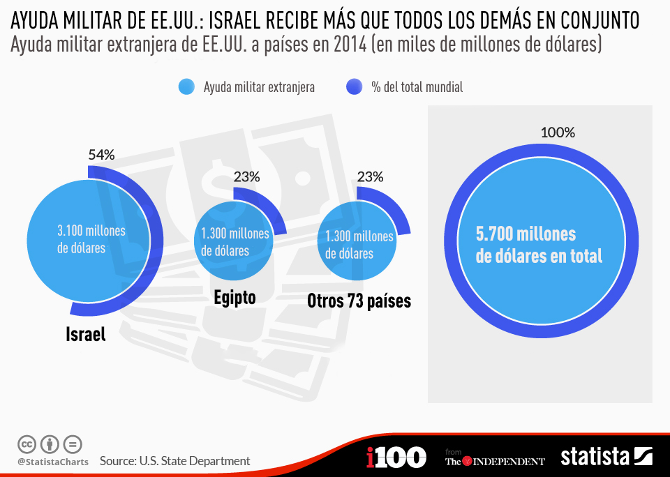 Una infografía publicada en el portal Statista muestra cómo se distribuyó la ayuda militar extranjera estadounidense el año pasado. Así, resulta que a Egipto fue entregada una cuarta parte de un total de 5.700 millones de dólares (1.300 millones), mientras que Israel recibió más que los demás 74 países en conjunto: 3.100 millones de dólares. La petición para el año 2015 para estos dos países constituye la misma suma.