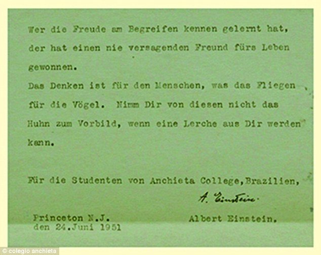 "Aquel que alcanza la alegría del entendimiento ha ganado un amigo infalible para la vida. El pensar es al hombre lo que volar a los pájaros. No sigan el ejemplo de las gallinas cuando podrían ser una alondra", dice la nota del científico firmada el 24 de junio de 1951.