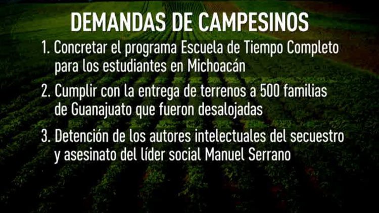 Después de mantener un plantón de dos meses afuera de la Secretaría de Gobernación sin recibir soluciones exigen que se concrete el programa Escuela de Tiempo Completo para los estudiantes de Michoacán, que se cumpla con la entrega de terrenos a 500 familias del estado de Guanajuato que fueron desalojadas y la detención de los autores intelectuales del secuestro y asesinato del líder social Manuel Serrano.