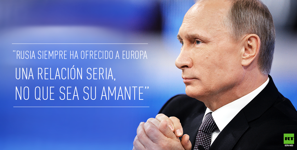 En una pregunta, el periodista del diario italiano ha dicho que "circulaba una opinión de que Rusia se siente traicionada, abandonada por parte de Europa, como cuando una amante deja a su amante". "Nunca hemos tratado a Europa como a una amante", ha respondido Putin. "Estoy hablando ahora absolutamente en serio. Siempre hemos ofrecido unas relaciones serias. Y en este momento, tengo la impresión de que Europa precisamente estaba intentando construir una relación con nosotros de carácter material, y únicamente para su propio beneficio", ha agregado Putin.