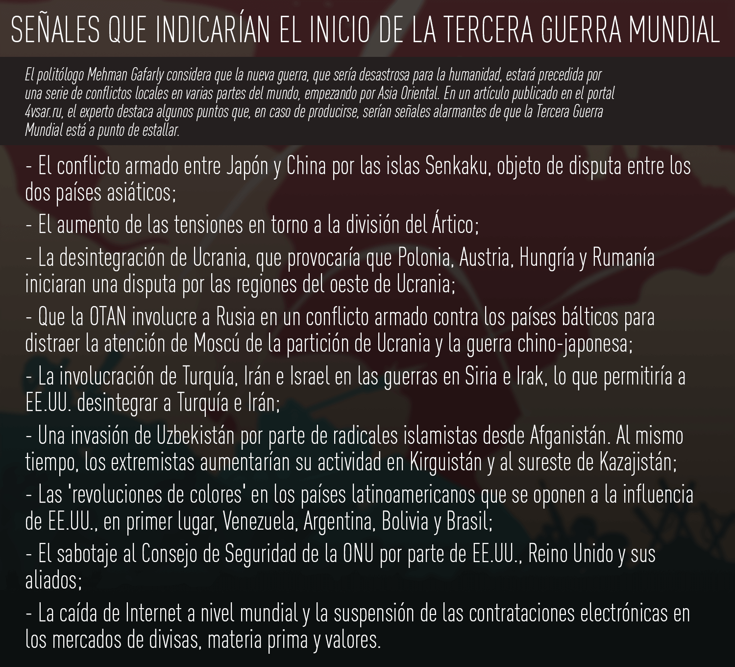 Entretanto, cada vez más voces alertan de una inevitable o casi inevitable guerra mundial que tendría consecuencias catastróficas para la humanidad, y algunos incluso especulan sobre las fechas concretas de su desarrollo.