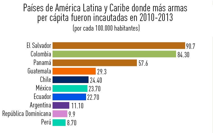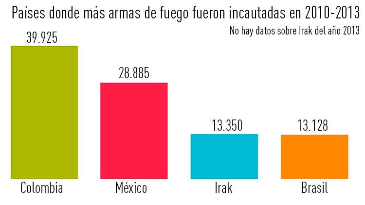 En 2010-2013 los policías de Colombia confiscaban de promedio 39.925 armas de fuego al año, mientras que en México la cifra era de 28.885. Los autores del informe llaman la atención sobre la brusca caída registrada en México, donde, según los datos oficiales, en 2011 fueron confiscadas 40.996 armas de fuego, y en 2012 'tan solo' 25.803, es decir un 59% menos.