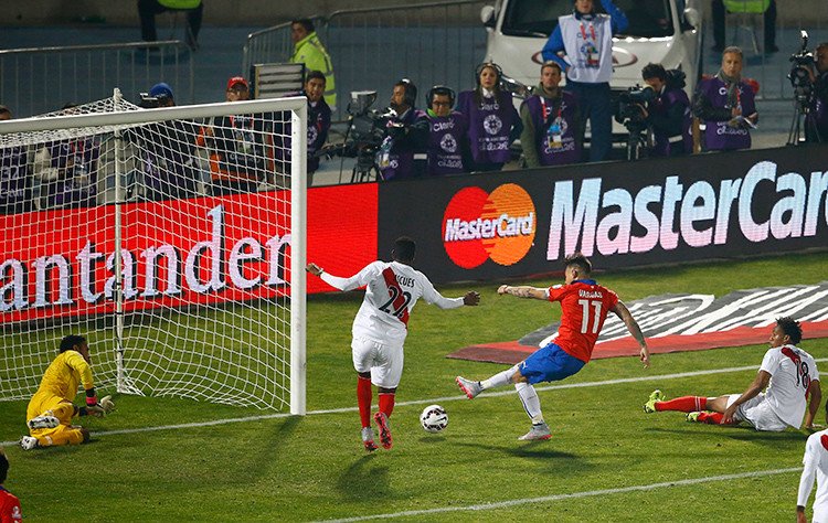 33': ¡¡¡Huuuuuuyyyy!!! La más clara ahora para Chile. Advíncula vuelve a salvar el arco peruano. El remate de Vargas a puerta vacía rebotó en el lateral.