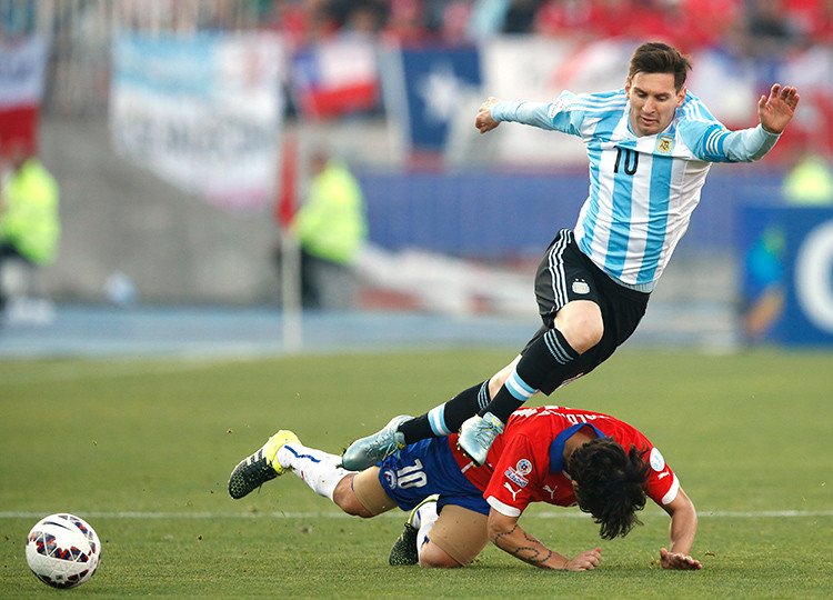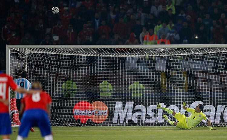 20': ¡Bravo salva a Chile sobre la línea! El portero ataja un cabezazo de Agüero en el área chica tras el centro de Messi.