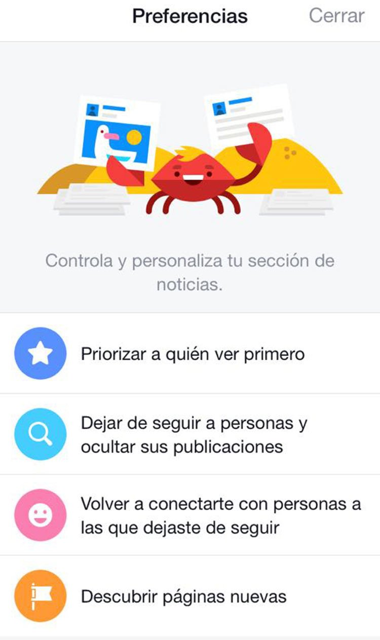 Pero ahora Facebook, utilizado al menos una vez al mes por alrededor de 1.500 millones de personas, ha dado cierto grado de control al usuario, quien puede elegir qué historias desea leer más, suscribirse a notificaciones de una página preferida y excluir actualizaciones de las que no le interesan.
