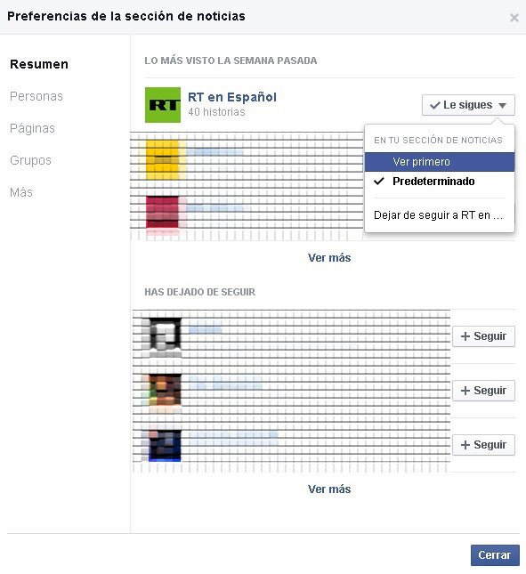 Para cambiar la opción en los ordenadores personales, hace falta entrar en la configuración en la parte superior derecha de la página, y en 'Preferencias de la sección de noticias' pulsar una barra rectangular que se encuentra al lado del nombre de la página que dice 'Le sigues' y elegir 'Ver primero' para leer de manera prioritaria las noticias publicadas por este amigo o página.