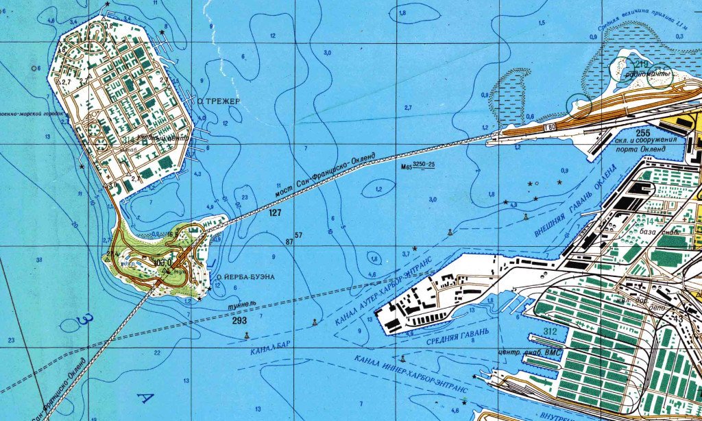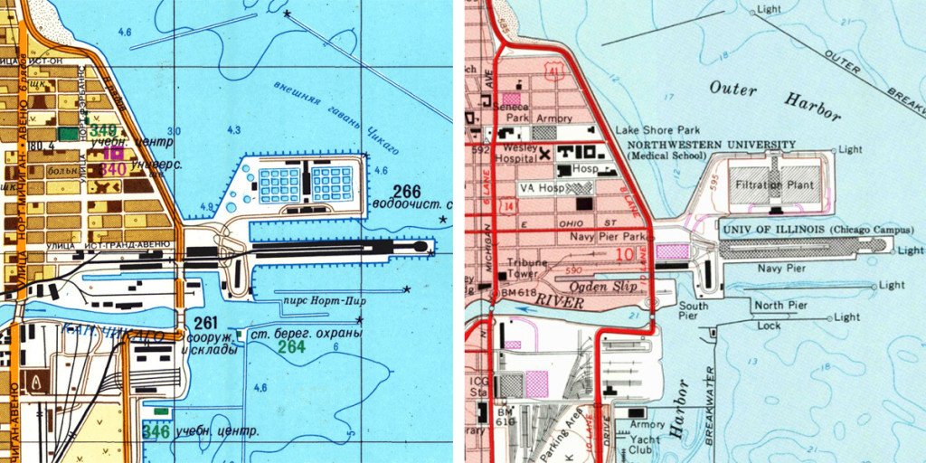 A diferencia del mapa de 1984 del Servicio Geológico de EE.UU. del lago de Chicago, el mapa soviético de 1982 detalla los edificios individuales en y las estructuras en el Navy Pier.