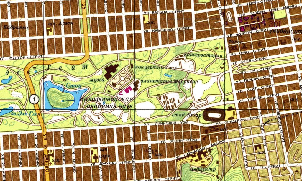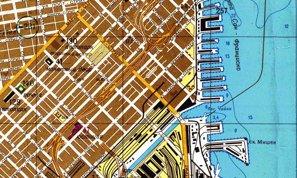 El mapa de 1980 de la ciudad de San Diego señala objetos de evidente interés estratégico (una base submarina, una base aérea naval, depósitos de municiones, ábricas de aviones y armamento), pero también recoge datos del transporte público, sistemas de comunicaciones, la altura o la arquitectura de los edificios en varias zonas de la ciudad.