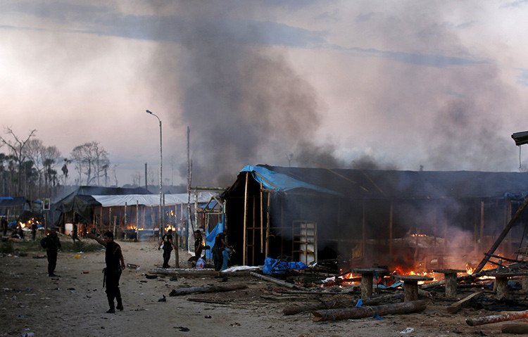 En la operación sin precedentes del Gobierno peruano contra la minería ilegal han participado 900 policías armados y helicópteros, que descendieron sobre una mina de oro ilegal y el asentamiento que había crecido a su alrededor, La Pampa. Cientos de trabajadores ilegales y sus familias se quedaron sin hogar, ya que sus casas fueron incendiadas por los agentes de la ley.