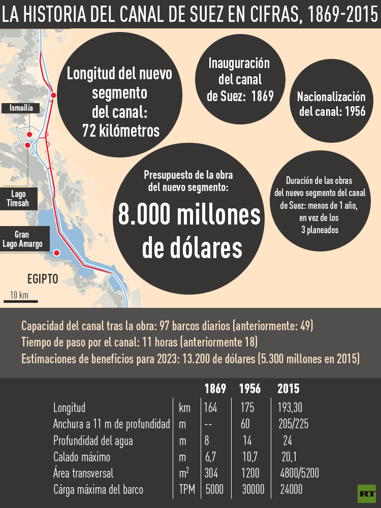Con el nuevo tramo del canal El Cairo prevé duplicar la capacidad de esta arteria de transporte hasta alcanzar los 97 barcos diarios en lugar de los 49 que la atraviesan hoy en día. Además, el tiempo de tránsito debe reducirse de 18 a 11 horas.
